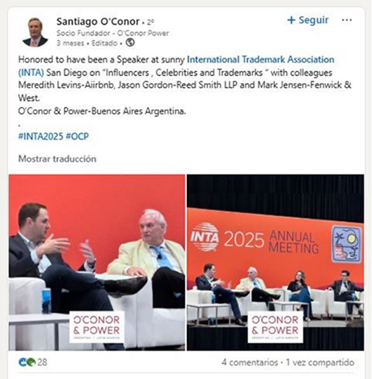 Influencers and Trademarks: our partmer Santiago R. O’Conor was speaker during the INTA San Diego Annual Meeting, 2025 |